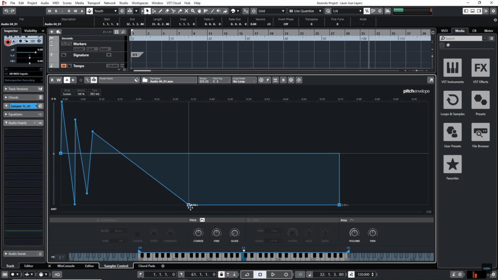 For the actual designing of the gun layers, we’ll use a sampler. I like to use the native Cubase sampler or Phase Plant sampler, but any sampler should do as long as it has a pitch envelope you can edit.